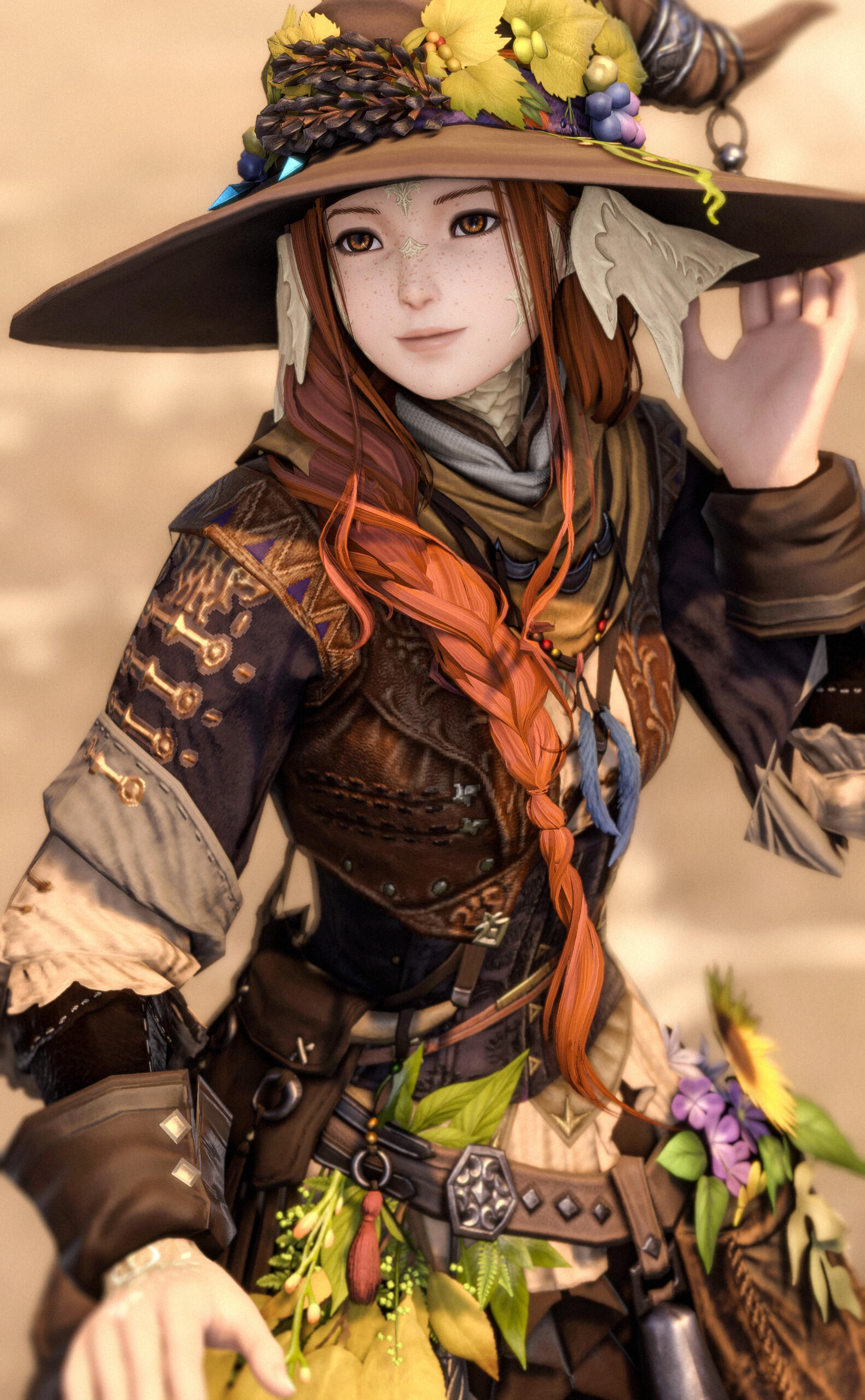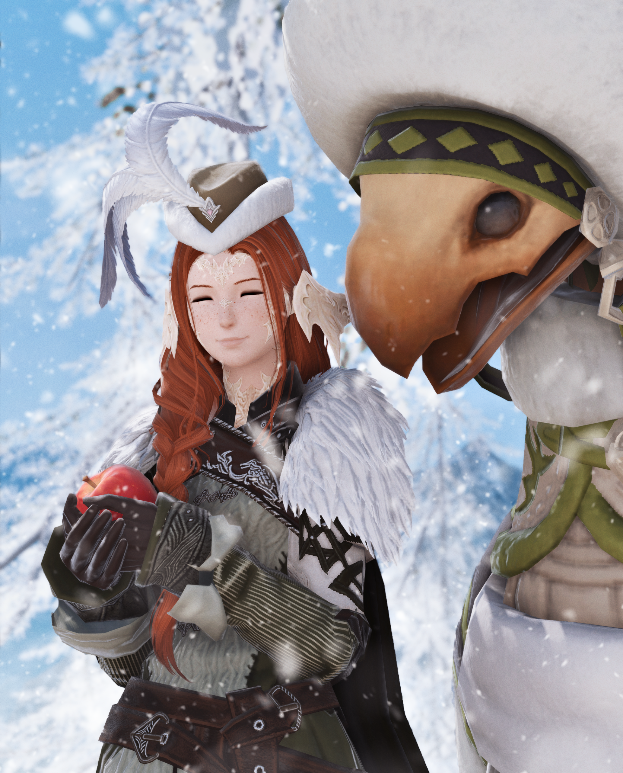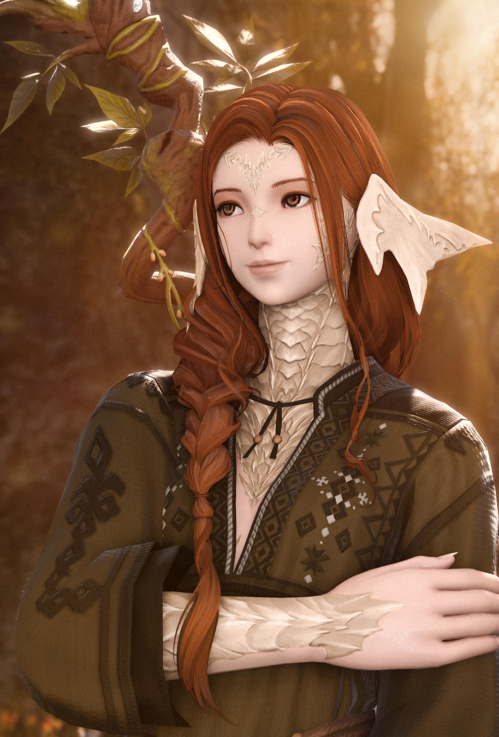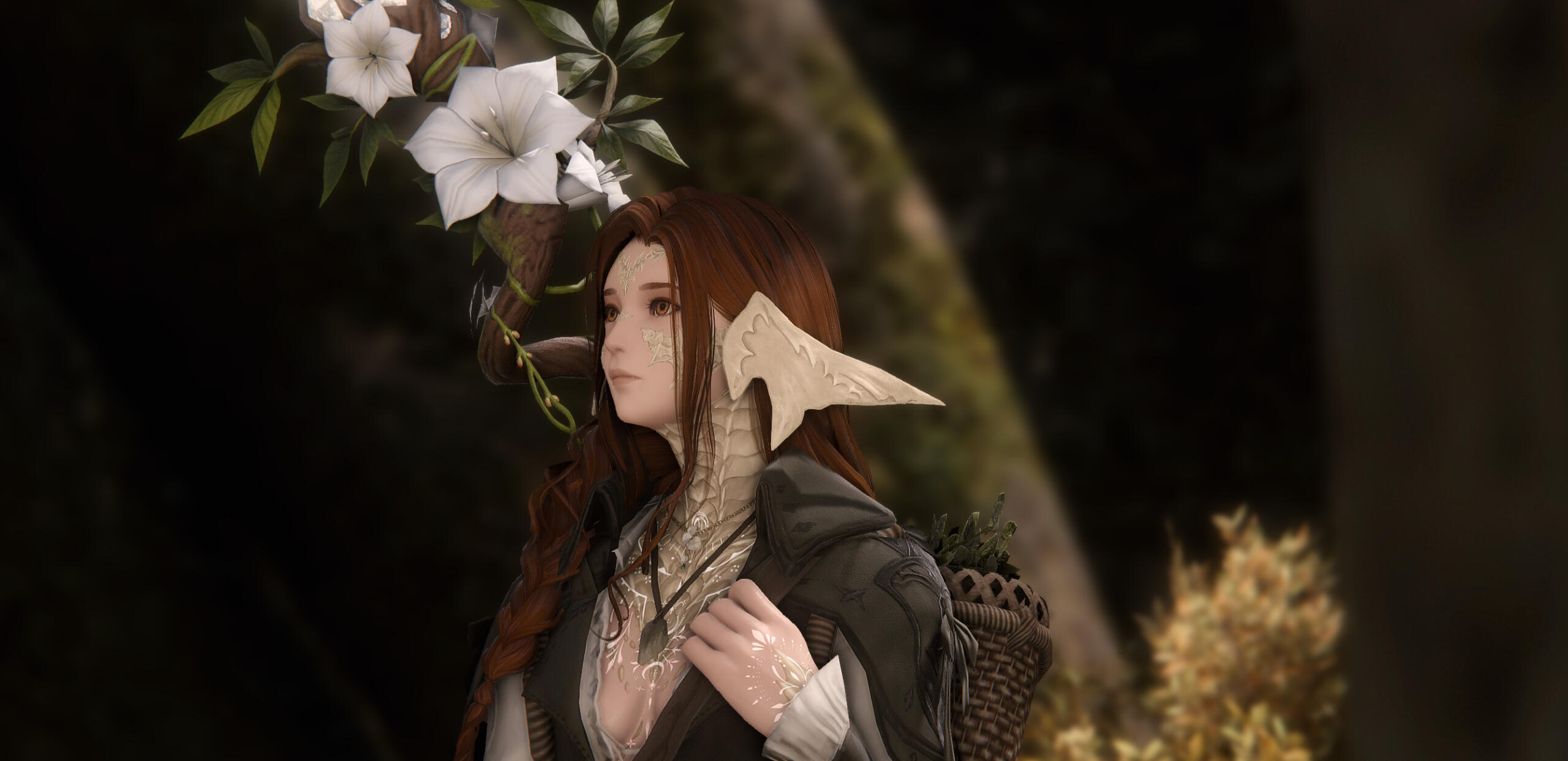 What one sees. At first glance, one might see a small, almost dainty Raen with pale skin and long, auburn hair in a braid over her shoulder, ivory horns shimmering in the sunlight, a basket full of freshly plucked herbs and fruit on their back, a sturdy walking staff in hand with flowers and vines curling around it, almost encasing the glowing crystal atop the staff. Looking closer, it becomes apparent that Moriko is no stranger to physical labor. Wiry muscles that speak of endurance and hands stained with colors of the earth as well worn leather boots, covered with dust and mud. More often than not they can be seen accompanied by a chocobo with heavy saddle bags, happily chirping and trotting alongside Moriko - Tori, they call him.