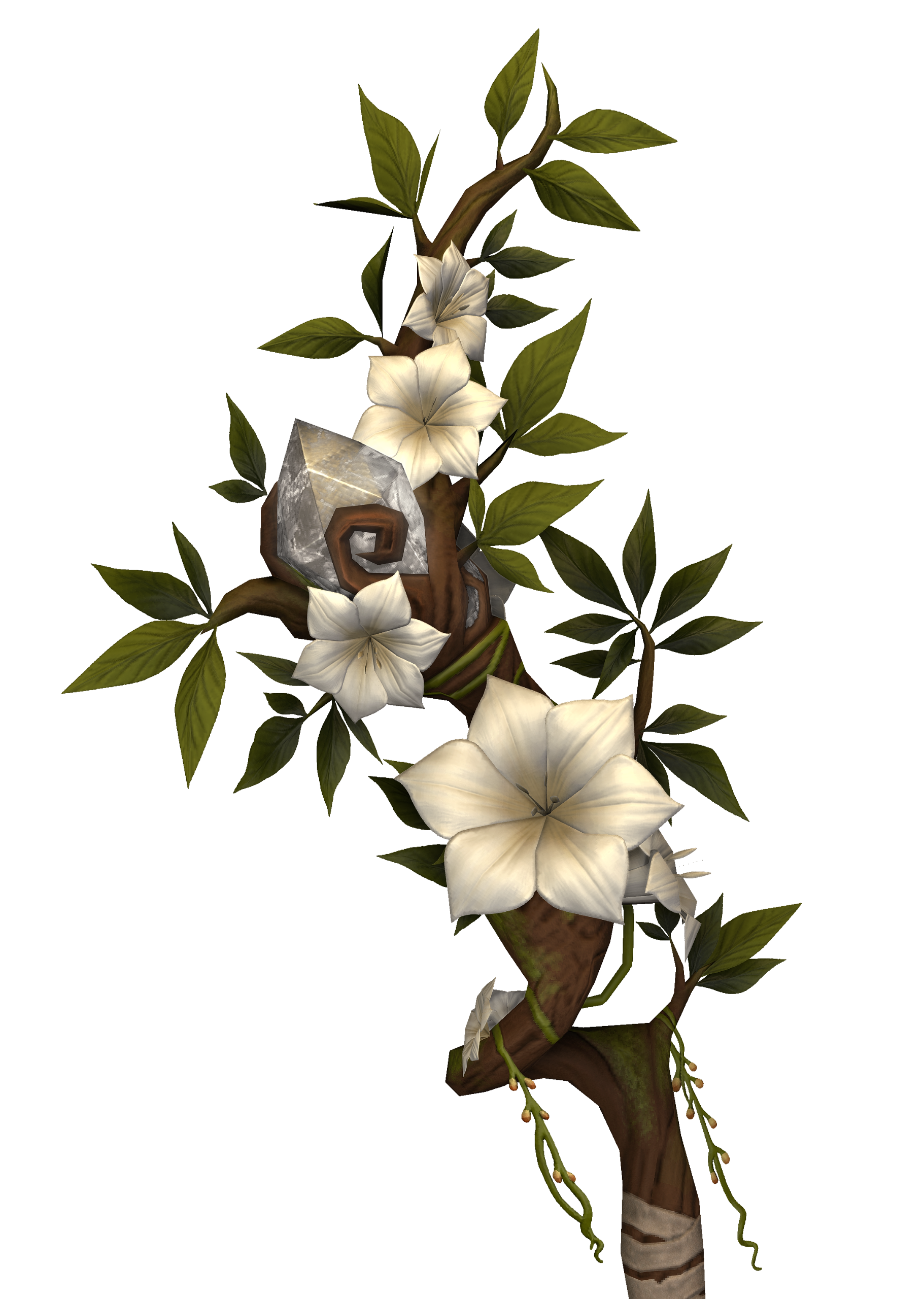 Walking staff. A sturdy, gnarled wooden staff with white flowers and vines and a glowing crystal on top. Moriko never leaves home without it and will use it to walk, to cast spells or simply to fend off critters trying to nip her heels.